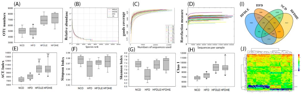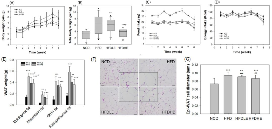 3.?分組方式:①正常膳食組(NCD)、②高脂膳食組(HFD)、③高脂+低藻(10 mg/kg/d)膳食組(HFD-LE)、④高脂+高藻(50 mg/kg/d)膳食組(HFD-HE)。