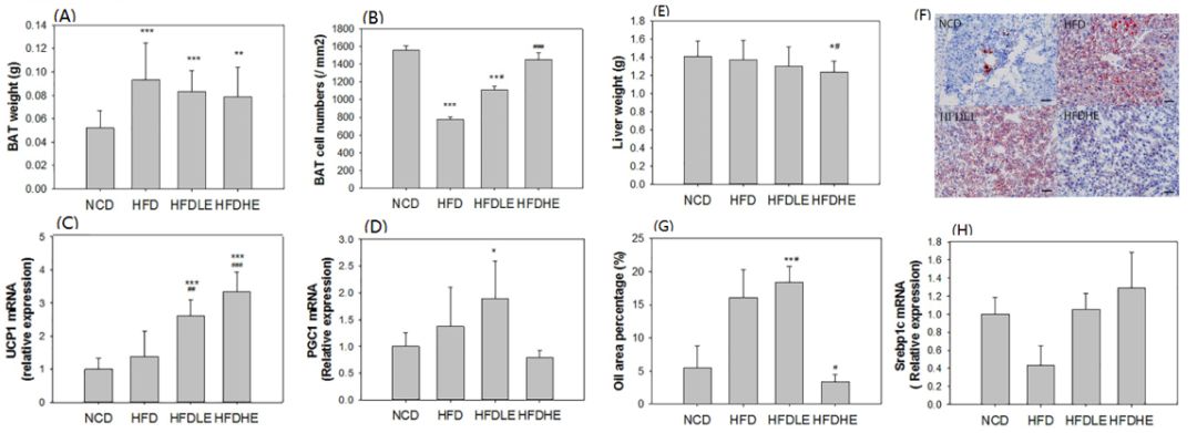 NLE未能顯著降低HFD導(dǎo)致的BAT增長(圖2A),與脂肪代謝有關(guān)的UCP1和PGC1基因表達(dá)在HFD-LE組中顯著升高(圖2C-2D),HFD-HE顯著降低了肝重(圖2E),NLE對HFD誘導(dǎo)的脂肪增生具有有效的抑制作用(圖2F-2G)。Srebp1c與肝脂肪的變性有關(guān),NLE對HFD導(dǎo)致的Srebp1c基因表達(dá)水平降低有恢復(fù)作用(圖2H)。