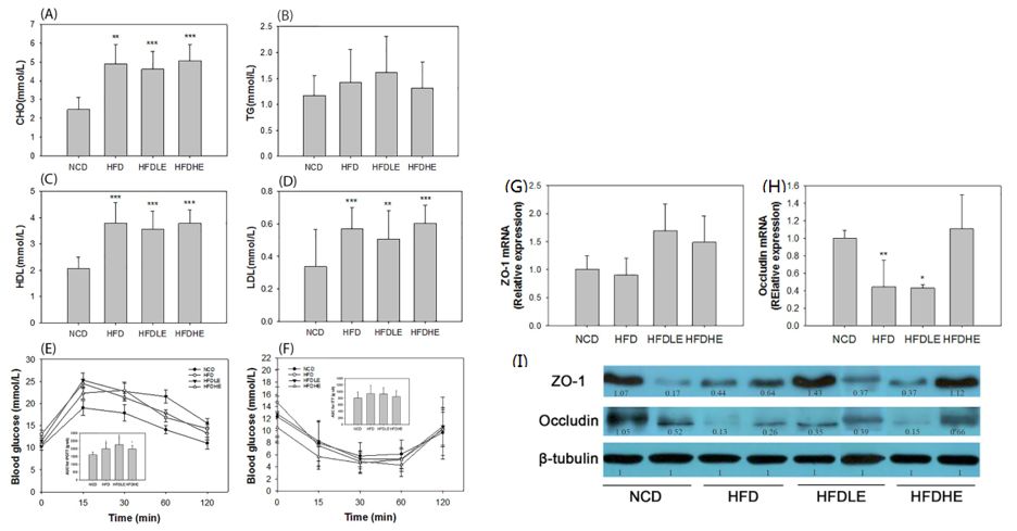 ?圖3. A-F:NLE對小鼠血脂、膽固醇、葡萄糖和胰島素耐受性的影響;G-I:NLE對小鼠緊密連接蛋白(ZO-1)和閉合蛋白的影響