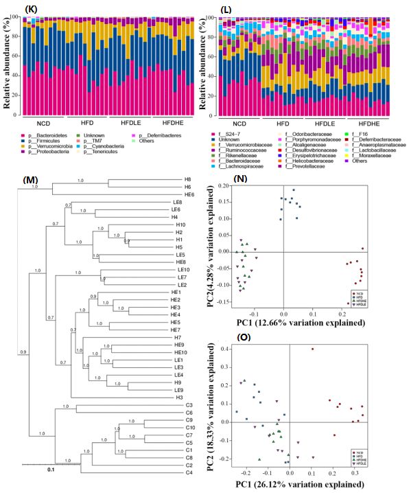 HFD導(dǎo)致小鼠腸道菌群的多樣性降低,然而NLE恢復(fù)了菌群多樣性(圖4)。Proteobacteria?、Epsilonproteobacteria、Helicobacteraceae?和Campylobacterales在HFD-HE組顯著富集(圖5H;5I),NCD與HFD-HE組的菌群結(jié)構(gòu)差異較?。▓D5J), NLE提高了HFD-HE和HFD-LE組Campylobacterales的豐度(圖5K)。NLE恢復(fù)了部分HFD導(dǎo)致的[K]轉(zhuǎn)錄和[G]碳水化合物代謝與運(yùn)輸?shù)墓δ茴愋停▓D5L)。