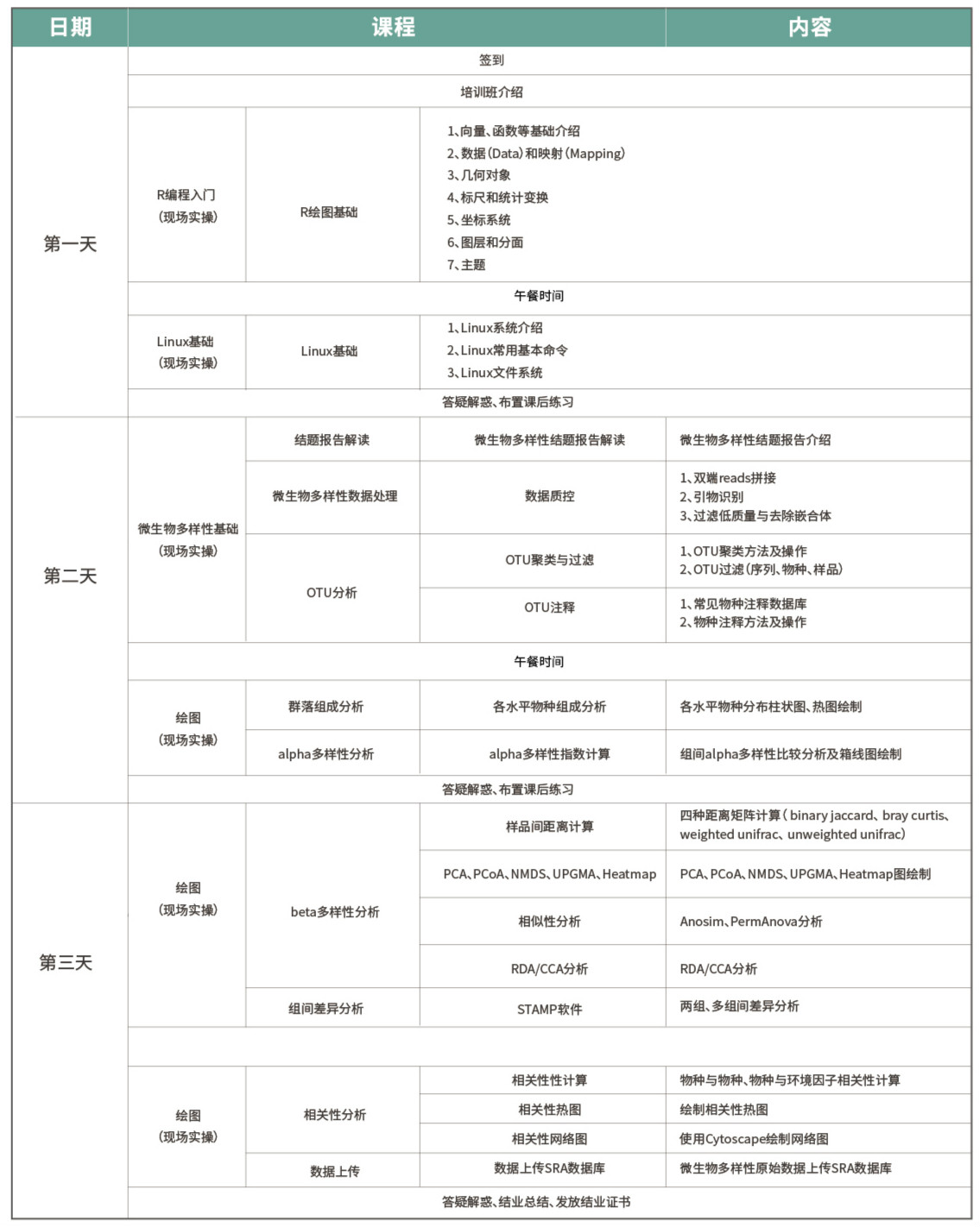 本次課程通過采用理論和實(shí)踐緊密結(jié)合的教學(xué)形式,以理論基礎(chǔ)至數(shù)據(jù)挖掘?qū)訉舆f進(jìn)的方式,讓大家在短時(shí)間內(nèi)對微生物研究中涉及的知識和方法得到迅速提升。同時(shí),在3天課程中,我們現(xiàn)場會有講師與助教與大家面對面的咨詢探討在研究思路、以及分析方面等遇到的問題,從而在多元思維中幫助大家開拓思路,挖掘微生物更多的價(jià)值。