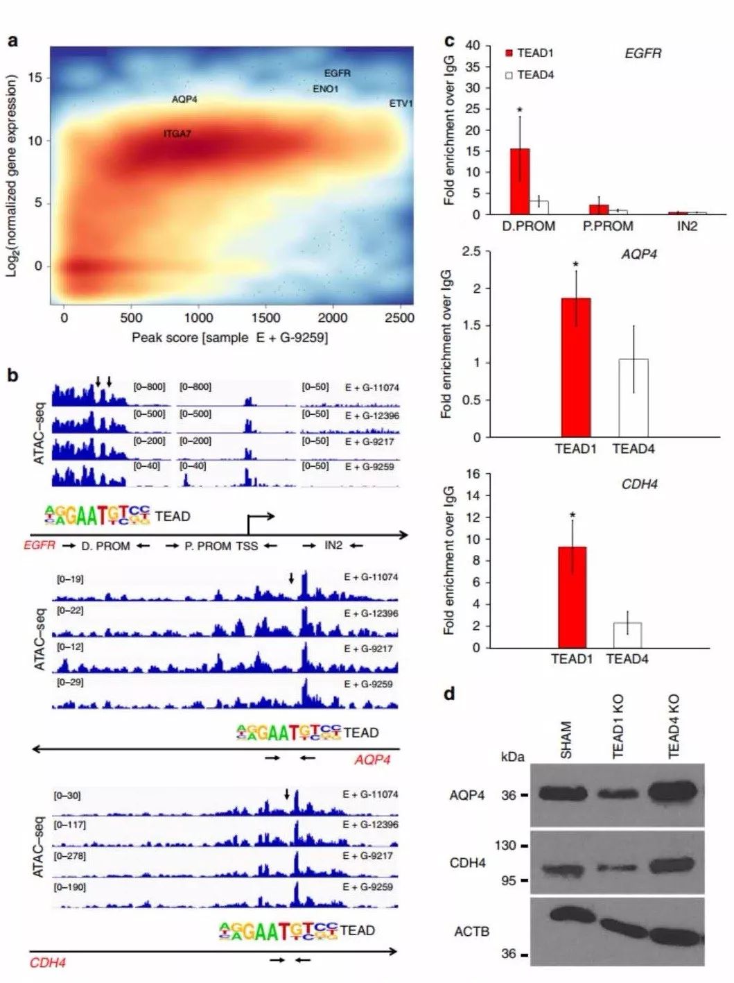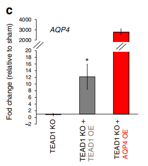 作者通過ATAC-seq和轉(zhuǎn)錄組測序數(shù)據(jù)篩選出來TEAD1的候選靶基因,并進一步利用ChIP-PCR,驗證了與TEAD1結(jié)合的靶基因–AQP4、EGFR和CDH4。TEAD1敲除使AQP4下調(diào),TEAD1過表達可恢復(fù)AQP4的表達,而TEAD1和AQP4過表達均可修復(fù)TEAD1KO細胞的遷移缺陷,說明TEAD1作用于靶基因AQP4,調(diào)控其表達,進而參與GBM遷移的直接調(diào)控機制。