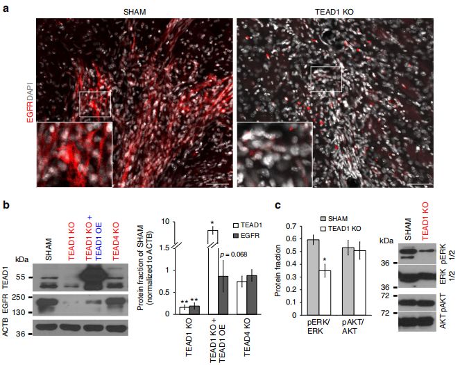 TEAD1KO異種移植樣本中EGFR的表達水平低于對照樣本,且TEAD1KO細胞系中EGFR表達相比于正常對照細胞系顯著下調(diào),TEAD1過表達后EGFR表達有回升。對EGFR下游信號元件的表達水平的檢測發(fā)現(xiàn),pERK在TEAD1KO細胞中下調(diào),而pAKT則不同。TEAD1KO細胞經(jīng)過較長時間的培養(yǎng)后,EGFR表達恢復(fù),而遷移仍受影響。因此,TEAD1直接且短暫地調(diào)控EGFR。