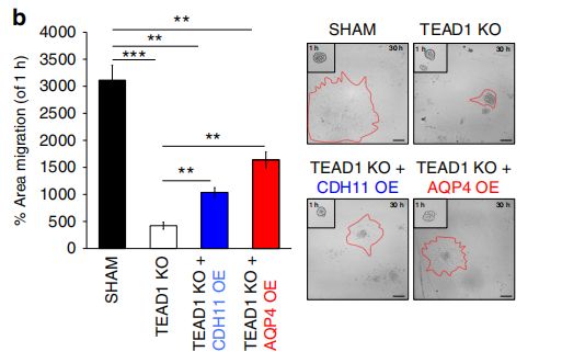 作者利用不同亞型人GBM腫瘤樣本,通過ChIP-PCR對TEAD1的候選靶基因進行驗證。進一步結(jié)合TEAD1KO相比于對照的異種移植樣本中靶基因表達水平,EGFR、AQP4、CDH4在TEAD1KO樣本中表達下調(diào),因此,TEAD1可能是通過結(jié)合靶基因EGFR、AQP4、CDH4調(diào)控其表達進而參與GBM遷移。