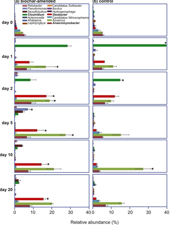 在生物炭修正組中,地桿菌(geobacter)相對轉(zhuǎn)錄豐度顯著高于對照組(無生物炭修正組)(圖4a),表明生物炭顯著提高了水稻土壤中地桿菌(geobacter)的轉(zhuǎn)錄活性。此外,生物炭對孵育初期的厭氧粘細(xì)菌(Anaeromyxobacter)和希瓦氏菌(Shewanella)的轉(zhuǎn)錄也有積極影響,然而抑制了對菌(clostridium)的轉(zhuǎn)錄水平(圖4b-d)。