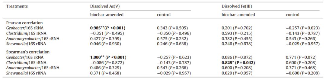 表1. 地桿菌(Geobacter)、?梭菌(Clostridium)、厭氧粘細(xì)菌(Anaeromyxobacter)和希瓦氏菌(Shewanella)的相對轉(zhuǎn)錄水平與釋放砷As(V)和鐵Fe(III)的Pearson和Speraman相關(guān)性檢驗(yàn).