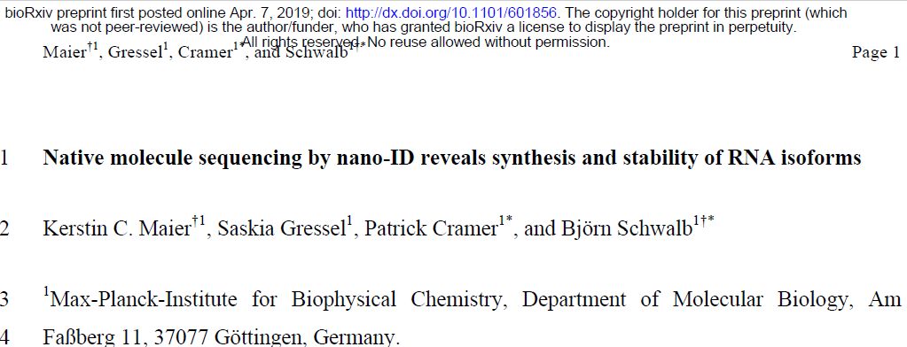Maier K C, Gressel S, Cramer P, et al. Native molecule sequencing by nano-ID reveals synthesis and stability of RNA isoforms[J]. bioRxiv, 2019: 601856.
