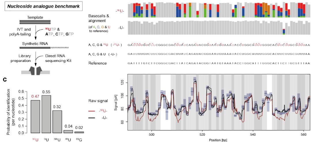 一個主要挑戰(zhàn)是尋找合適的核苷類似物用于RNA標(biāo)記和檢測標(biāo)記的RNA isoform,已知標(biāo)記效率限制在約2-3%,即100個天然核苷酸中只有2個或3個被核苷酸類似物取代。作者利用ERCC標(biāo)準(zhǔn)品,分別以添加核苷酸類似物和不添加的天然堿基作體外轉(zhuǎn)錄,將體外轉(zhuǎn)錄產(chǎn)物進行nanopore direct RNA測序,比較了幾種不同的核苷酸類似物:5EU(5-Ethynyluridine,5-乙炔基尿苷)、5BrU(5-bromouridine,5-溴尿苷)、5IU(5-iodouridine,5-碘尿苷)、4sU(4-thiouridine,4-硫代尿苷)和?6sG(6-thioguanine,6-硫鳥嘌呤)。最終結(jié)果表明:5EU和5IU標(biāo)記檢出率比較高,且5EU對細胞無毒性。且5EU標(biāo)記的新合成RNA中約有一半U可以被識別為5EU,且從原始電信號中可以明顯區(qū)分5EU和天然U堿基。選用5EU進行體內(nèi)實驗。