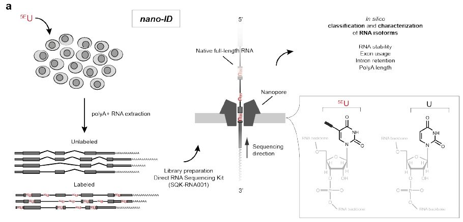 因此作者開發(fā)了nano-ID(nanopore sequencing-based Isoform Dynamics ),其結(jié)合了代謝RNA標(biāo)記、天然RNA分子的“長讀長”納米孔測序和機器學(xué)習(xí)。
