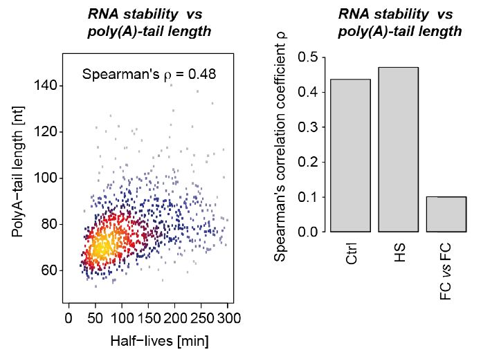熱休克反應(yīng)(42°C 60min)處理,許多RNA isoform改變了合成速率、穩(wěn)定性和剪接模式。nano-ID分析結(jié)果表明,對于某一個基因座對應(yīng)的組合RNA混合物(基因水平)的代謝變化與單一轉(zhuǎn)錄本代謝變化差異非常大。雖然組合的RNA穩(wěn)定性與poly(A)尾巴長度相關(guān),但是單個RNA isoform可以顯著偏離。nano-ID能夠在不同細胞狀態(tài)和條件下研究單個RNA分子和isoform水平的RNA代謝。