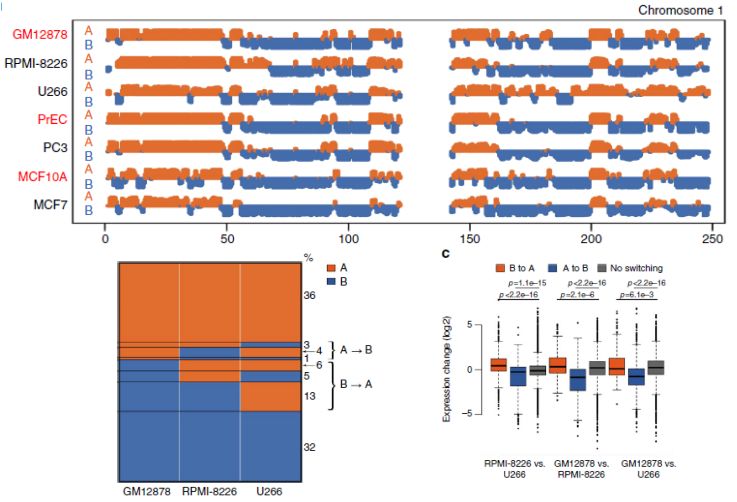 腫瘤細(xì)胞系與正常細(xì)胞系間A/B?compartment轉(zhuǎn)換(Pengze Wu1,et al,NC)