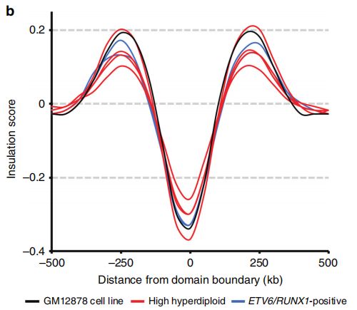 在此,作者對(duì)匹配基因組圖數(shù)據(jù)集(WGS/WES/芯片)的樣本進(jìn)行蛋白組質(zhì)譜檢測(cè)、RNA測(cè)序,并通過(guò)Hi-C對(duì)超二倍體和ETV6/ runx1陽(yáng)性的兒童原發(fā)性患者樣本進(jìn)行三維構(gòu)象研究。作者發(fā)現(xiàn)作為染色質(zhì)結(jié)構(gòu)的主要調(diào)控因子的CTCF和黏連蛋白,在超二倍體中均表現(xiàn)出低表達(dá)。與此同時(shí),在超二倍體個(gè)體中發(fā)現(xiàn)了與拓?fù)潢P(guān)聯(lián)域(TAD)邊界相關(guān)的基因表現(xiàn)為普遍的表達(dá)失調(diào)。此外,超二倍體兒童ALL患者的Hi-C表明,2/4病例的TAD邊界強(qiáng)度明顯丟失,3/4病例的TAD邊界絕緣程度降低。