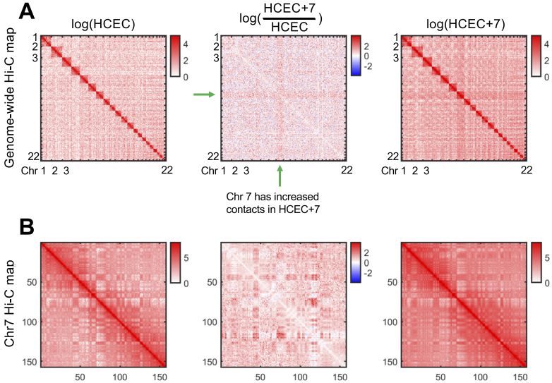 作者研究了一個(gè)正常核型的健康結(jié)腸粘膜構(gòu)建的細(xì)胞系及其同源的衍生細(xì)胞系,該衍生細(xì)胞系唯一異常是有一個(gè)額外的7號(hào)染色體拷貝(47,XY,+7)。作者使用Hi-C、RNA測(cè)序和蛋白質(zhì)組分析研究了非整倍化后結(jié)構(gòu)、功能的變化及其關(guān)系。7號(hào)染色體的增加導(dǎo)致了該染色體基因轉(zhuǎn)錄水平的增加,以及全基因組基因和蛋白表達(dá)的變化。Hi-C分析表明,7號(hào)染色體的額外拷貝反映在三倍體染色體間有更多的染色體間互作,且全基因組范圍內(nèi)出現(xiàn)了染色質(zhì)組織的變化,包括A/B區(qū)域化和拓?fù)潢P(guān)聯(lián)域(TAD)邊界的變化。最值得注意的是,4號(hào)染色體顯示出染色質(zhì)組織的嚴(yán)重缺失,而14號(hào)染色體包含一個(gè)大的A/B?compartment轉(zhuǎn)換區(qū)域,同時(shí)其中的基因表達(dá)發(fā)生改變。間期FISH檢測(cè)染色體涂染探針距離發(fā)現(xiàn)額外的7號(hào)染色體區(qū)域的核位置未發(fā)生變化。此外衍生細(xì)胞系中基因和蛋白富集在惡性轉(zhuǎn)化的關(guān)鍵信號(hào)通路,如HGF/MET-axis??傊?,一個(gè)特異的染色體非整倍體對(duì)核結(jié)構(gòu)和功能有重大影響,無(wú)論是局域的還是全基因組的,此研究為分析具有復(fù)雜核型的癌癥核組織提供了一個(gè)基礎(chǔ)。