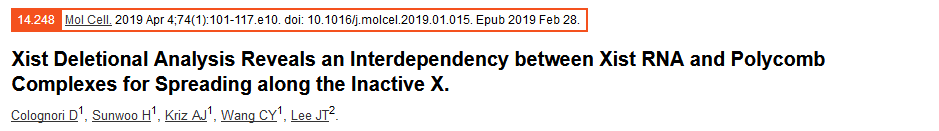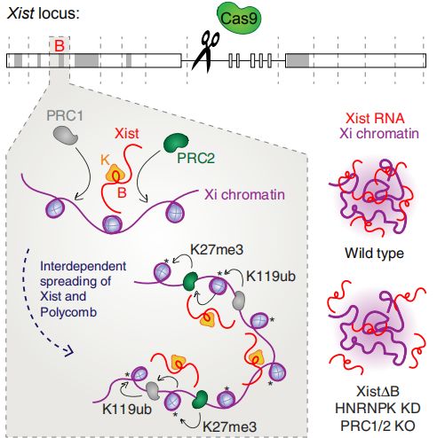 在X染色體失活期間,Xist RNA傳播包覆整個(gè)染色體,以建立沉默,但是參與傳播的功能RNA元件及機(jī)制仍未確定。作者通過(guò)一個(gè)全面的內(nèi)源性Xist缺失研究,發(fā)現(xiàn)Repeat B 對(duì)于在Xist的傳播和多梳狀復(fù)合物1和2 (PRC1/PRC2)的作用至關(guān)重要,會(huì)影響染色體的三維結(jié)構(gòu)。刪除Repeat B或其直接結(jié)合伴侶HNRNPK會(huì)影響PRC1和PRC2的招募。反過(guò)來(lái),去除PRC1或PRC2又會(huì)削弱Xist的傳播。因此,Xist和多梳狀復(fù)合物傳播包覆整個(gè)染色體時(shí)具有彼此依賴性,這三個(gè)因子對(duì)于X染色體失活至關(guān)重要,且三者是密不可分的。