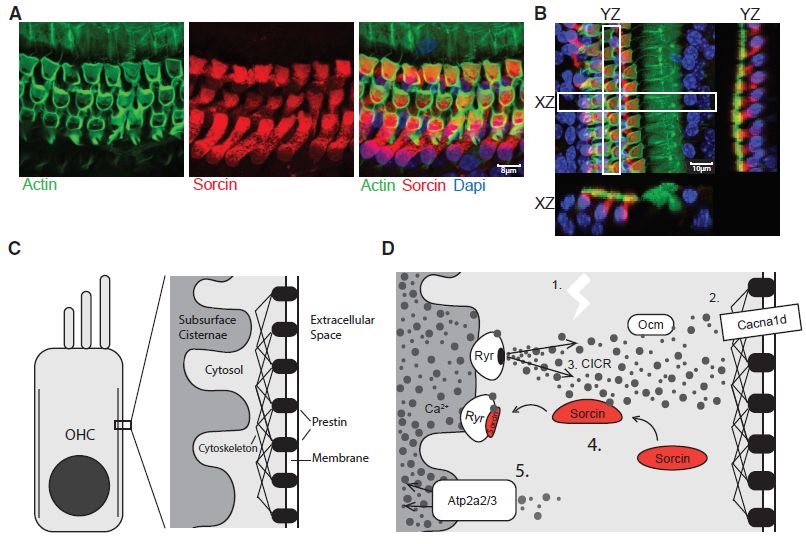 免疫熒光僅將sorcin僅定位于OHC(圖3A,3B),假設(shè)類似的機(jī)制可以調(diào)節(jié)基于prestin的運(yùn)動(dòng)(圖3C和3D,動(dòng)力蛋白?Prestin是一種高度專業(yè)化的蛋白質(zhì),可以起到驅(qū)動(dòng)耳蝸中外部毛細(xì)胞的作用,使耳蝸可以讓人們和動(dòng)物聽(tīng)到聲音)。與此可能性一致,作者確定了在OHCs中表達(dá)sorcin介導(dǎo)的興奮-收縮途徑的基本組分,包括(1)電壓門(mén)控鈣釋放通道,(2)促進(jìn)CICR的通道,(3)終止CICR的機(jī)制(sorcin),和(4)鈣泵使釋放的Ca2+返回Ca2+儲(chǔ)庫(kù)(圖3E)。本數(shù)據(jù)集和他人數(shù)據(jù)集中檢測(cè)到的第一個(gè)組分是耳聾基因Cacna1d,一種在OHCs中高表達(dá)的電壓門(mén)控鈣釋放通道,參與心動(dòng)過(guò)緩有關(guān)的綜合征性耳聾;第二個(gè)組分,即促進(jìn)CICR的通道,包括Ryr1、Ryr2和Ryr3。在通過(guò)Ryr通道誘導(dǎo)CICR后,sorcin的作用可能是通過(guò)在Ca2+存在下阻斷Ryr受體來(lái)快速終止CICR,這是先前在心肌細(xì)胞中報(bào)道的途徑。已知定位于OHC表面下池的Ca2+?ATP酶泵可從細(xì)胞溶質(zhì)中除去Ca2+。附著蛋白質(zhì)(Ocm)等結(jié)合并緩沖Ca2?+的輔助蛋白質(zhì)可能有助于這一過(guò)程。
