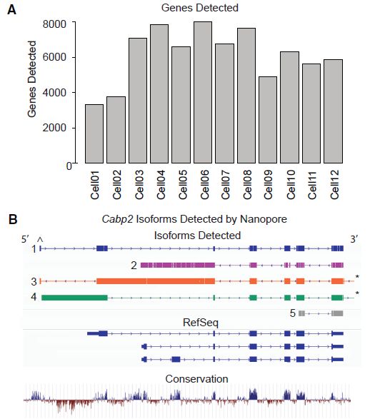 Nanopore長(zhǎng)讀長(zhǎng)RNA-seq(全長(zhǎng)轉(zhuǎn)錄組測(cè)序)揭示剪接多樣性和isoform豐度。