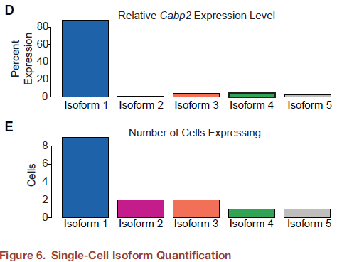 為了解決全長(zhǎng)isoform結(jié)構(gòu),進(jìn)行了ONT全長(zhǎng)轉(zhuǎn)錄組測(cè)序,并使用Illumina短reads序列數(shù)據(jù)作為確認(rèn)的scaffold,用于nonopore長(zhǎng)讀長(zhǎng)數(shù)據(jù)比對(duì)。與150-800bp片段大小的Illumina?reads不同,Nanopore測(cè)序不需要片段化文庫(kù),并且可以產(chǎn)生跨越mRNA轉(zhuǎn)錄本長(zhǎng)度的單一reads(圖6A和6B)。對(duì)p15時(shí)間點(diǎn)的12個(gè)OHC細(xì)胞加barcaod以在4個(gè)MinION?R9.4?flow?cell上測(cè)序所有樣品,同時(shí)保持單細(xì)胞分辨率(圖6A)。因?yàn)镺HCs是最多和最差異的Illumina數(shù)據(jù)集,這有助于跨平臺(tái)比較以驗(yàn)證長(zhǎng)reads和isoform定量。