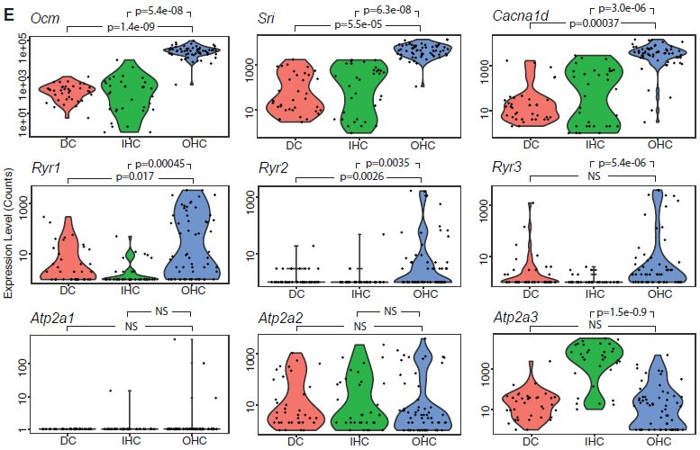 已知細(xì)胞類型marker基因高度差異表達(dá),例如prestin(Slc26a5),其在OHCs中穩(wěn)健且差異表達(dá)。與公布的OHC和IHC轉(zhuǎn)錄組數(shù)據(jù)進(jìn)行比較,搜索具有不一致排名的基因,假設(shè)通過(guò)AUC而不是表達(dá)水平對(duì)基因進(jìn)行排序?qū)⒃诟鼜V泛的表達(dá)水平上鑒定細(xì)胞類型定義基因。按AUC分類排名時(shí),兩個(gè)鈣相關(guān)基因Ocm和Sri在OHC定義基因列表中排名第一,甚至超過(guò)Slc26a5,排名第三(上圖2F)。先前已在OHC中報(bào)道了Ocm的表達(dá)。編碼蛋白質(zhì)oncomodulin(癌調(diào)蛋白)是鈣結(jié)合蛋白家族成員之一,它是耳蝸聽(tīng)力擴(kuò)增所必需的。Sri編碼sorcin(可溶性耐藥相關(guān)鈣結(jié)合蛋白),一種在心肌細(xì)胞中表達(dá)的蛋白質(zhì),是鈣介導(dǎo)的興奮-收縮偶聯(lián)所必需的,通過(guò)抑制Ryr通道(Ca2+釋放通道/RyR受體)進(jìn)行鈣離子介導(dǎo)的鈣離子釋放?(CICR)。在肌細(xì)胞中,Ryr通道介導(dǎo)CICR,能夠從肌質(zhì)網(wǎng)中快速釋放Ca2+離子,從而產(chǎn)生對(duì)于肌肉收縮必不可少的時(shí)空限制性鈣火花。