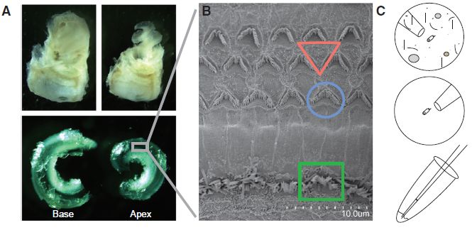 與哺乳動(dòng)物耳蝸中的各種支持細(xì)胞類型相比,聽(tīng)覺(jué)HC的豐度較低。為了估計(jì)小鼠耳蝸膜迷路中可用于單細(xì)胞分離的HC數(shù)量,據(jù)報(bào)道在成熟的小鼠耳蝸中約765個(gè)IHCs,通過(guò)對(duì)小鼠顳骨中心切片,細(xì)胞核計(jì)數(shù),估計(jì)小鼠膜性迷路中的細(xì)胞數(shù)為415,395,其中IHC和OHC比例僅為0.19%和0.59%。
