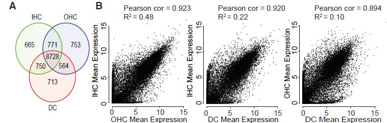 為了比較細(xì)胞類型之間表達(dá)譜,計(jì)算各cluster內(nèi)所有細(xì)胞中每個(gè)基因平均表達(dá)水平。通過(guò)維恩圖對(duì)平均表達(dá)譜比較,每種細(xì)胞類型約表達(dá)700個(gè)特異基因(OHC-753;?IHC-655;?DC-713;歸一化后counts>10)。且發(fā)現(xiàn)IHCs和DC具有高比例重疊(共享750個(gè)基因,與OHC和DC共享564個(gè)基因相比),但是IHC和OHC共享771個(gè)基因表達(dá)(圖2A)。為了更嚴(yán)格地測(cè)試每種細(xì)胞類型的轉(zhuǎn)錄相似性,使用所有基因進(jìn)行Pearson相關(guān)和R2回歸分析?;貧w分析,所有3組間比較中發(fā)現(xiàn)了強(qiáng)相關(guān)性,OHCs和IHC之間的相關(guān)性最高,OHCs和DC之間的相關(guān)性最低。OHC和DC表達(dá)譜最不相似可能反映了OHC高水平特化(圖2B)。