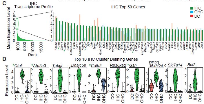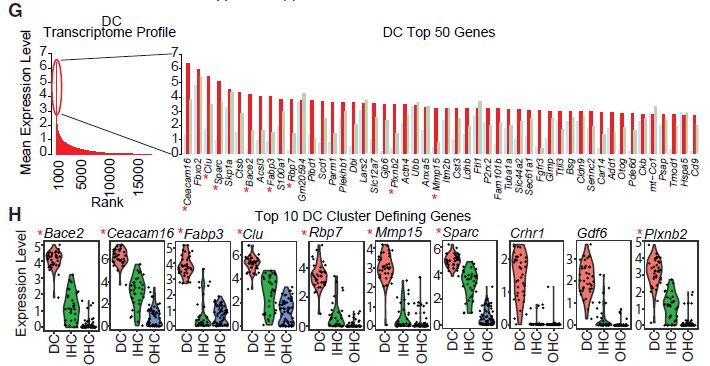 為了定義每種細(xì)胞類型的特征性表達(dá)譜,通過(guò)cluster內(nèi)各個(gè)細(xì)胞的標(biāo)準(zhǔn)化表達(dá)水平對(duì)所有基因進(jìn)行排序。每種細(xì)胞類型的表達(dá)譜通過(guò)少量高表達(dá)基因(對(duì)數(shù)平均表達(dá)水平在2和7之間)和大量低表達(dá)基因(對(duì)數(shù)平均表達(dá)水平<2)來(lái)表征(圖2C,2E和2G)。在按細(xì)胞類型排名前50的最高表達(dá)基因中,一些基因,如Fbxo2和Skpa1,在所有3種細(xì)胞類型中高度表達(dá);而其他基因,如Ocm和Fgfr3,主要僅在一種細(xì)胞類型中表達(dá)。使用AUC排序,提取每組的cluster定義基因以鑒定特定細(xì)胞類型特異性marker基因(圖2D,2F和2H)。前10個(gè)cluter定義基因的小提琴圖揭示了眾所周知的marker基因OHC(Ocm和Slc26a5)、IHC(Otof和Atp2a3)和DC(Bace2和Ceacam16)??梢酝ㄟ^(guò)scRNA-Seq瀏覽器工具(Web資源:https://morlscrnaseq.org/)訪問(wèn)小提琴圖對(duì)應(yīng)的完整基因列表。