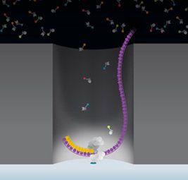 PB的測序空間為ZMW(zero-mode wave guides,零模波導(dǎo)孔),外徑100多納米,DNA分子掉入孔中,不同熒光標(biāo)記的脫氧核苷酸在聚合酶的作用下,會(huì)產(chǎn)生不同的熒光信號(hào),隨后標(biāo)記基團(tuán)自動(dòng)脫落,維持了信號(hào)的持續(xù)監(jiān)測。激光從ZMW底部打入,由于孔直徑很小而不能穿過孔進(jìn)入上方溶液區(qū),從而把背景噪音降到最低。