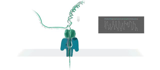 ONT測序?qū)⑷斯ず铣傻囊环N多聚合物的膜浸在離子溶液中,多聚合物膜上布滿了經(jīng)改造的穿膜孔的跨膜通道蛋白(納米孔),也就是Reader蛋白,在膜兩側(cè)施加不同的電壓產(chǎn)生電壓差,DNA鏈在馬達(dá)蛋白的牽引下,解螺旋通過納米孔蛋白,不同的堿基會(huì)形成特征性離子電流變化信號(hào),通過對這些信號(hào)的檢測,得到堿基序列,完成測序。