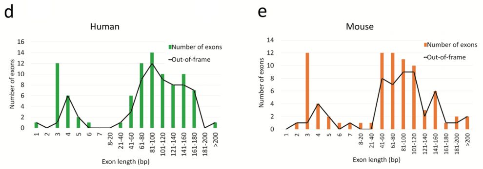 將circRNA根據(jù)新外顯子使用分類為“隱蔽的circRNA外顯子”(與注釋的外顯子共享5’或3’剪接位點)或“獨特的circRNA外顯子”(全新的外顯子)。人類2,393個外顯子中的91個和小鼠中2,487個外顯子中的82個是獨特的circRNA外顯子,140和163個分別是隱蔽的circRNA外顯子。(所有單外顯子circRNA都被排除在該分析之外,因為在單個read中需要完全覆蓋檢測到的外顯子,這對于單個外顯子circRNA而言在技術(shù)上是不可能的。)作者發(fā)現(xiàn)大多數(shù)獨特的circRNA外顯子在40-200bp范圍內(nèi),但也經(jīng)常觀察到3-6bp的非常短的外顯子(微外顯子)組。有趣的是,大多數(shù)circRNA特異性外顯子導(dǎo)致移碼突變或終止密碼子獲得,可能解釋了它們在線性mRNA翻譯中缺失,因此受到無義介導(dǎo)降解。