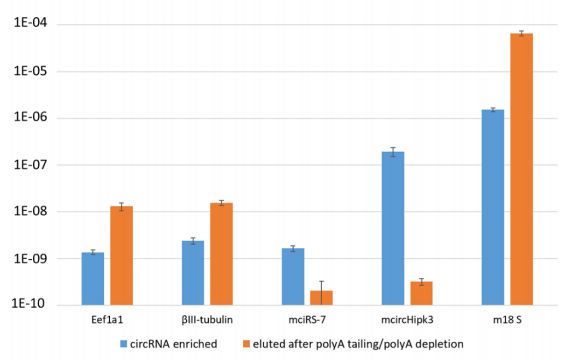 只有一小部分RNA是環(huán)狀的(例如,小鼠神經(jīng)系統(tǒng)中去rRNA的RNA庫中僅占約0.1%)。作者采用上述方法進(jìn)行circRNA-ONT測序,由于有些線性RNA分子對RNase R具有抗性,故而此方法比普通的去線性circRNA建庫多了一步:將剩余的線性RNA多聚腺苷酸化(poly A tailing)并使用poly(A)純化磁珠去除帶polyA尾的RNA分子。結(jié)果表明,該步驟使circRNA強烈富集。