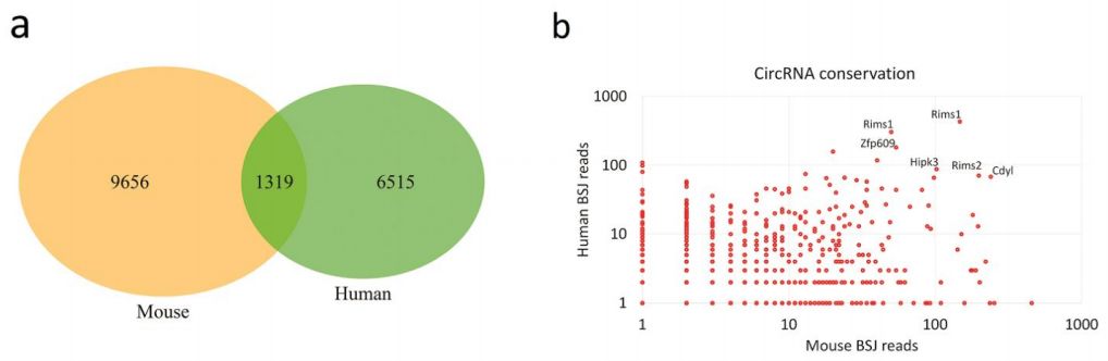 人和小鼠circRNA文庫的納米孔測序分別產(chǎn)生0.67M和1.06M reads,其中3.2%和3.3%跨越circRNA BSJ(Back splice junction)位點。人和小鼠中分別鑒定到7,834和10,975個circRNA,其中1,319個在人和鼠中保守的circRNA。在最高表達(dá)和保守的circRNA中,發(fā)現(xiàn)眾所周知的腦circRNA,例如circRims1、circRims2、circHipk3、circCdyl和circZfp609。整個數(shù)據(jù)集中,分別來自人和小鼠的2,945和7,052個circRNA先前未在circBase中注釋。