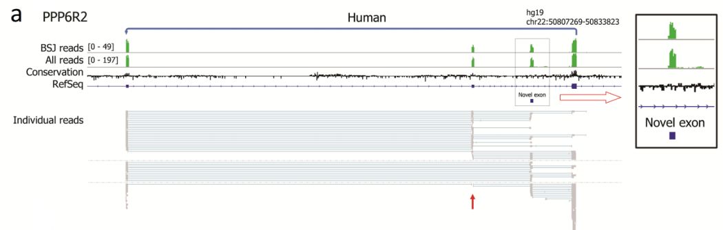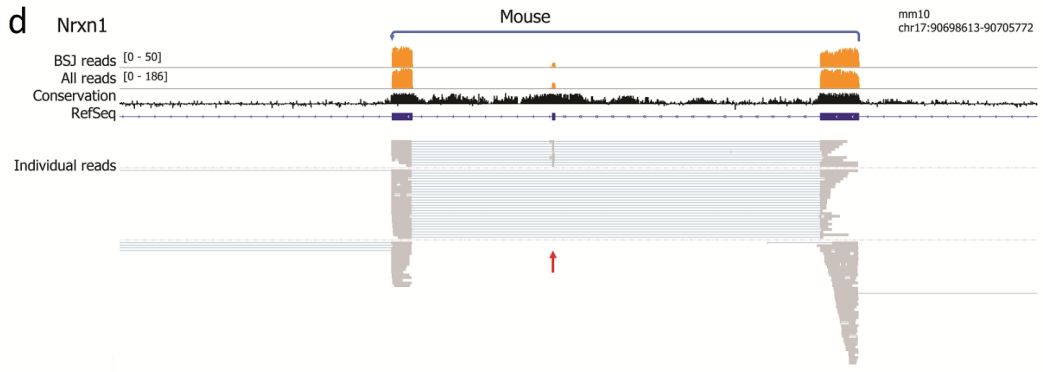 環(huán)狀RNA(circRNA)是一類知之甚少的非編碼RNA,其中一些已被證明對細(xì)胞增殖和發(fā)育具有功能重要。CircRNA主要來自編碼mRNA的反向剪接事件,使得難以區(qū)分circRNA與線性剪接的mRNA的內(nèi)部外顯子組成。為了檢查circRNA的全局外顯子組成,作者使用納米孔技術(shù)對人和小鼠腦源RNA進(jìn)行了單分子長讀長測序。