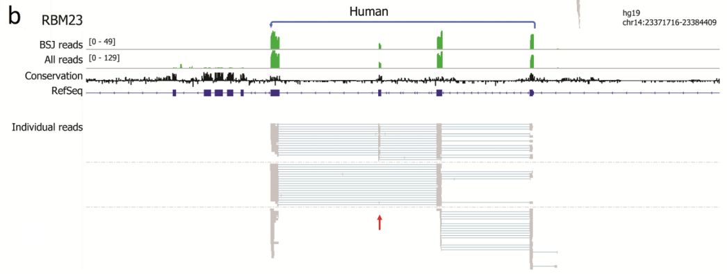 Rahimi K, Veno M T, Dupont D M, et al. Nanopore sequencing of full-length circRNAs in human and mouse brains reveals circRNA-specific exon usage and intron retention[J]. BioRxiv, 2019: 567164.