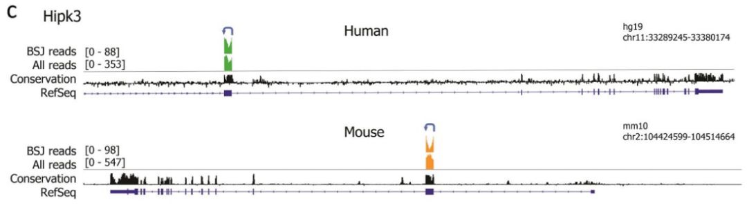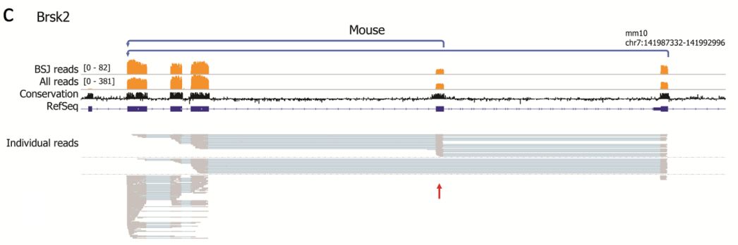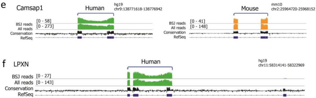 將所有小鼠和人跨越BSJ reads與各自的參考基因組比對,并定量比對到外顯子或內(nèi)含子區(qū)域的堿基對的數(shù)量。為了將分析集中于更豐富的circRNA中的內(nèi)含子保留和其他可變剪接事件,僅進(jìn)一步研究了具有10個或更多BSJ reads并具有高于3%的平均內(nèi)含子百分比的circRNA。作者發(fā)現(xiàn)3個人和4個小鼠circRNA具有內(nèi)含子保留,而39和57個circRNA包含分別在人和小鼠的RefSeq中未注釋的外顯子序列。CAMSAP1 是circRNA內(nèi)含子保留實例,其僅發(fā)生在人RNA中;LPXN circRNA是僅在人中表達(dá)的circRNA。