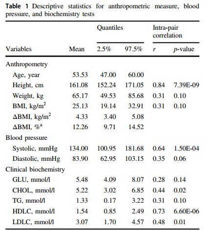 表1展示了樣本相關(guān)人體測量和生化變量的結(jié)果。最后一列是每個變量的對內(nèi)相關(guān)性。大多數(shù)變量具有相當(dāng)高的和/或顯著相關(guān)性,一些顯示低或不顯著的對內(nèi)相關(guān)性(例如GLU,TG)。下圖顯示了每對雙胞胎的BMI測量值。所有雙胞胎都與對角線保持距離,表明BMI測量中的對內(nèi)不一致。同時,圖中的總體模式還表明如表1中報告的BMI的弱配對內(nèi)相關(guān)性(r = 0.307,p = 0.099)。在男性(實點)和女性(空點)雙胞胎中沒有觀察到BMI不一致的性別特異性模式。