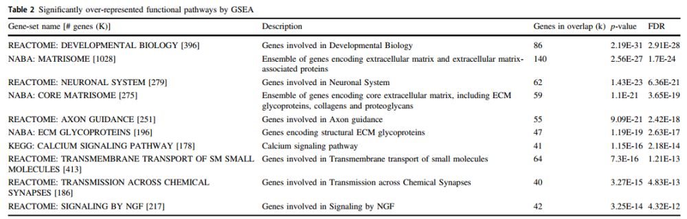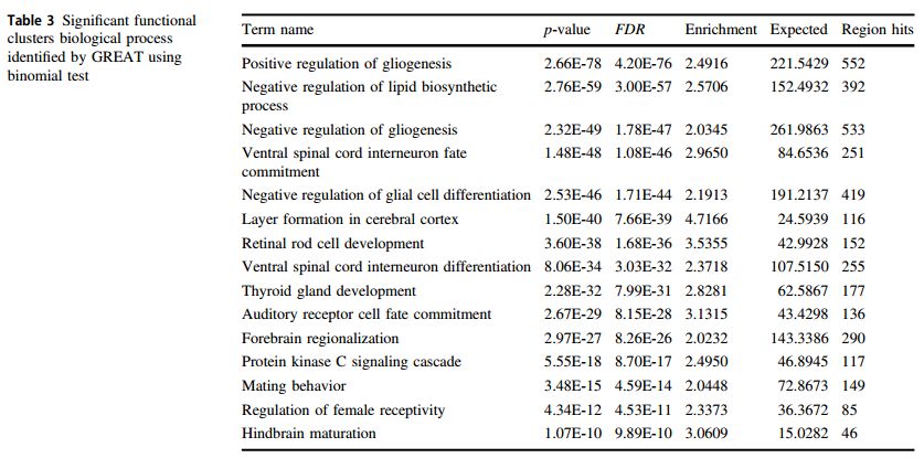 采用biomaRt,38487個CpG中(P<0.05),23,863個CpG注釋到2542個功能基因,基于GSEA在BioCarta 基因集, KEGG 基因集和Reactome基因集富集分析。富集通路相關(guān)基因包括參與編碼細(xì)胞外基質(zhì)(ECM)相關(guān)蛋白,包括ECM糖蛋白、膠原蛋白和蛋白多糖;以及參與神經(jīng)元系統(tǒng)和發(fā)育生物學(xué)的基因。富集結(jié)果也涉及神經(jīng)元功能通路,涉及參與化學(xué)突觸傳遞,軸突導(dǎo)向和NGF信號傳導(dǎo)(神經(jīng)生長因子)的基因。38,487(p < 0.05)個CpGs采用GREAT分析其富集的調(diào)控區(qū)域。結(jié)果表明15個具有統(tǒng)計學(xué)意義(p < 1.072e-10)的生物學(xué)功能聚類,涉及膠質(zhì)細(xì)胞再生正負(fù)調(diào)節(jié)(FE:2.49, FE:2.03)、脂質(zhì)合成負(fù)調(diào)節(jié)( FE:2.61)、甲狀腺發(fā)育 (FE:2.83)、視網(wǎng)膜桿細(xì)胞發(fā)育(FE: 3.54)等。