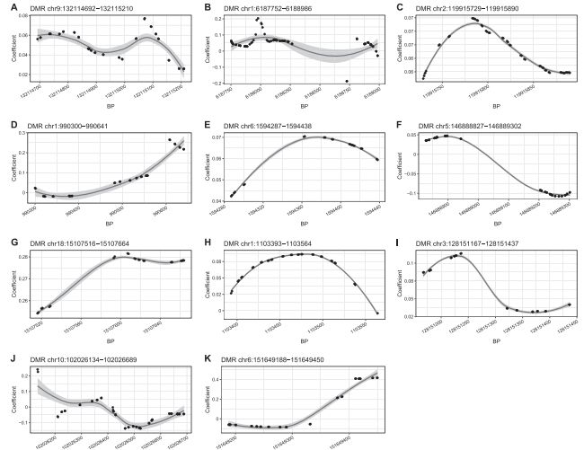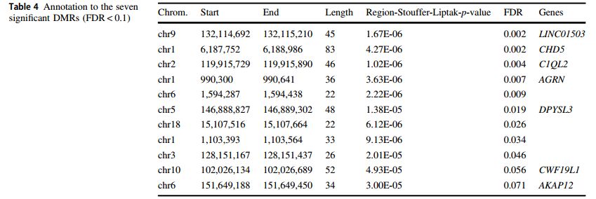 采用comb-p矯正p,鑒定出11個FDR<0.1的DMR,其中9個FDR<0.05,位于染色體1、2、3、5、6、9、10和18 。4個有意義的 DMRs (從chr 1:1103393-1103564,chr 1:990300-990641;chr 6:1594287-1594438;?chr 10:102026134-102026689 )包含了有顯著意義的CpGs 。4個DMR位于基因間區(qū),其余7個注釋在9號染色體LINC01503(RNA基因)、5號染色體DPYSL3(與非酒精性脂肪肝相關(guān)), 1號染色體CHD5和AGRN(有研究孕婦體重指數(shù)對新生兒血液DNA甲基化的影響), 2號染色體C1QL2, 10號染色體CWF19L1, 及6號染色體 AKAP12。圖中展示了11個DMR的甲基化模式,除了圖f和j的DMR與BMI呈負(fù)相關(guān)外,其余9個DMR與BMI呈正相關(guān)。采用Danish雙胞胎的基因表達(dá)數(shù)據(jù),檢驗了與11個DMR相關(guān)的7個基因表達(dá)水平與BMI的相關(guān)性。LINC01503和AKAP12有顯著意義。