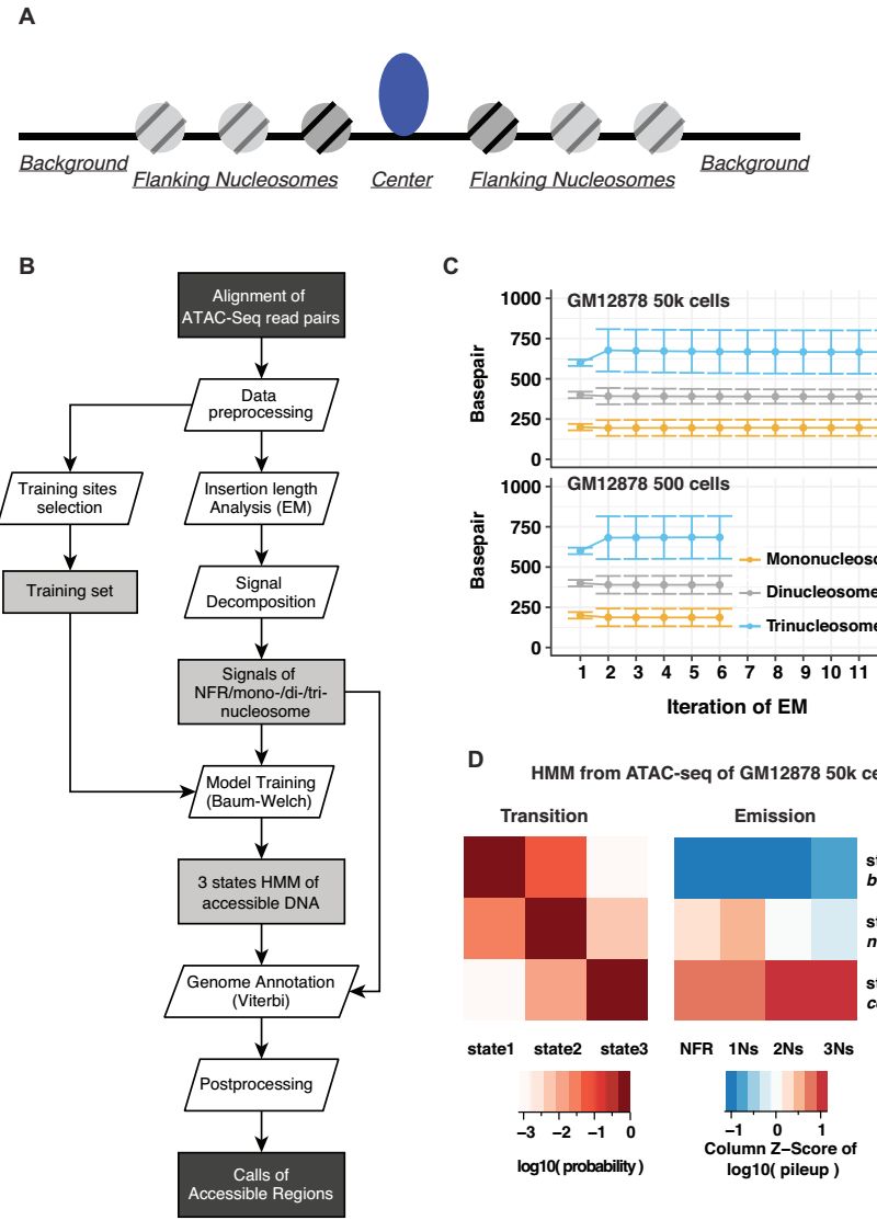 因此,作者提出了針對(duì)ATAC-seq數(shù)據(jù)的分析工具,HMMRATAC,一種基于半監(jiān)督機(jī)器學(xué)習(xí)方法。?HMMRATAC軟件的主要思想是decomposition and integration(分解和集成),首先將單個(gè)ATAC-seq數(shù)據(jù)集分成無(wú)核小體(nucleosome-free regions, NFR)和核小體富集信號(hào),用隱馬爾科夫模型(HMM)訓(xùn)練開放區(qū)域周圍獨(dú)特的染色質(zhì)結(jié)構(gòu),然后預(yù)測(cè)整個(gè)基因組中的開放區(qū)域。?該方法利用了ATAC-seq數(shù)據(jù)的獨(dú)特特征來(lái)識(shí)別的染色質(zhì)的結(jié)構(gòu)更準(zhǔn)確。