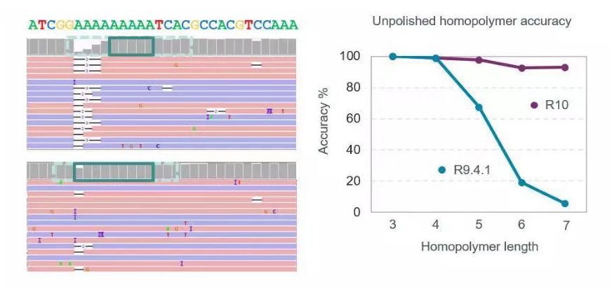 同聚物的識別準(zhǔn)確性是大家一直都比較關(guān)心的問題,從ONT官方釋放的測試結(jié)果顯示,相比于R9.4.1,R10版本芯片能夠顯著提高其在同聚物區(qū)域的堿基識別準(zhǔn)確度,并且?guī)缀醪粫肴笔уe(cuò)誤(圖5)。