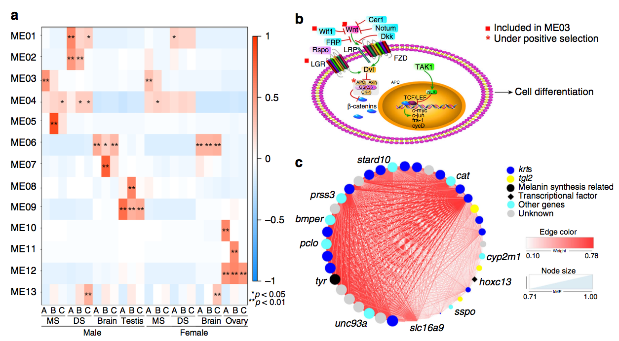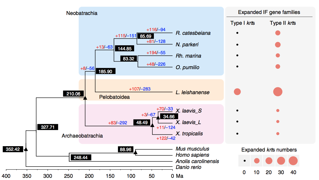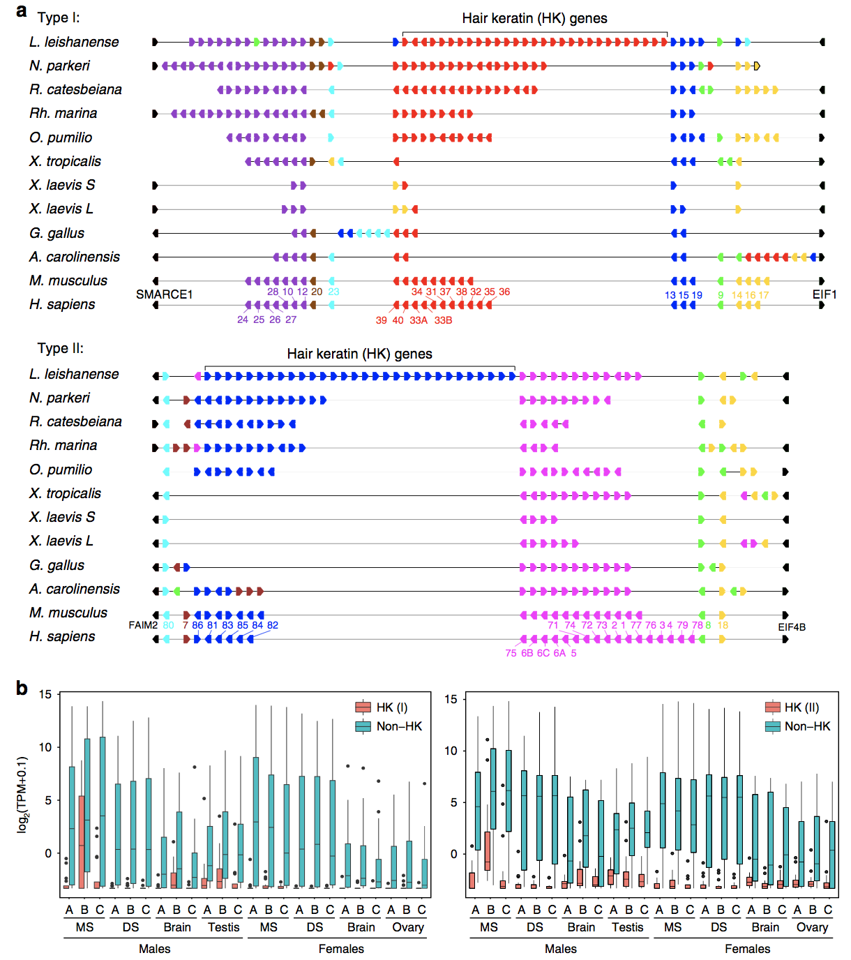 在雌雄異體的有性生物中,兩性之間在體型大小、形態(tài)結(jié)構(gòu)和功能等方面存在明顯差異的現(xiàn)象稱為性二態(tài)(Sexual dimorphism)。自然界普遍存在的性二態(tài)(如劍尾魚的劍狀尾和獅子的鬃毛等)一直是進(jìn)化生物學(xué)家關(guān)注的熱點(diǎn)問題。兩棲動物具有豐富的性二態(tài)特征,繁殖期的雄性雷山髭蟾在上頜的皮膚形成角質(zhì)刺,類似于人類的“胡子”,因此又被稱為“胡子蟾”,繁殖期過后,角質(zhì)刺外殼會脫落,而雌性則沒有這種特征。由于除了性染色體上的基因外,大多數(shù)的基因組在雄性和雌性之間是共享的,所以性二態(tài)往往是由基因在性別間差異性表達(dá)引起的。由于缺乏參考基因組,很少有研究能夠?qū)⑿詣e差異表達(dá)模式與特定的性二態(tài)特征聯(lián)系起來,與性二態(tài)性狀相關(guān)的重要生物學(xué)過程和關(guān)鍵基因也一直難以破解。本文成功的建立了一個具有代表性的鋤足蟾亞目基因組,并對其皮膚來源的性二態(tài)性狀進(jìn)行了分子基礎(chǔ)的研究。