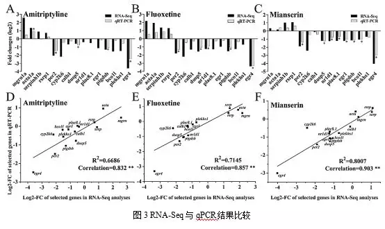 作者為了更好地了解不同種類抗抑郁藥誘導的毒性反應在非靶向魚類中的作用機制,用分屬于不同抗抑郁藥物類別的阿米替林(Amitriptyline hydrochloride)、氟西?。‵luoxetine hydrochloride)和鹽酸米安色林(mianserin hydrochloride)對早期發(fā)育階段的斑馬魚胚胎進行處理,然后進行了轉錄組測序(RNA-Seq),基于前面轉錄組的分析結果,作者采取兩組qPCR驗證實驗: