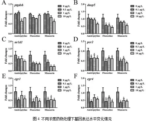 作者用三種不同濃度的抗抑郁藥(0.1、1和10 μg /L)處理斑馬魚胚胎,應用qPCR試驗確定6個選定的基因的濃度—應答關系。結果表明,ptgdsb的mRNA水平只在1 μg /L阿米替林和10 μg /L米安色林處理組顯著降低;而dusp5表達水平在10 μg /L阿米替林和米安色林處理組以及所有氟西汀處理組中均顯著降低;除了在1和10 μg /L阿米替林處理組中的nr1d1表達水平未受抑制之外,nr1d1和per2在幾乎所有抗抑郁藥物處理組均受到顯著抑制。此外,兩個與早期生長應答相關的基因egr1和egr4在0.1和10 μg /L阿米替林處理組和所有米安色林處理組中表達下調(diào),egr4在所有氟西汀處理組降低,而egr1只在0.1和10 μg /L氟西汀處理組中表達降低(圖4)。