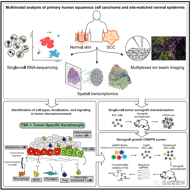 上皮性腫瘤約占人類(lèi)惡性腫瘤的90%。cSCC作為其中的一種,是美國(guó)第二常見(jiàn)的惡性腫瘤,每年發(fā)病人數(shù)超百萬(wàn)。盡管可以切除治療,但有高達(dá)4%的cSCC會(huì)發(fā)生淋巴結(jié)轉(zhuǎn)移,并且1.5%的患者最終死亡。近期cemiplimab(PD1抑制劑)的上市給與晚期和轉(zhuǎn)移癌患者以希望,但是腫瘤標(biāo)志物預(yù)測(cè)響應(yīng)的阻力和不足迫切需要更好的對(duì)腫瘤微環(huán)境(TME)進(jìn)行特征描述。本文結(jié)合單細(xì)胞測(cè)序、空間轉(zhuǎn)錄組等技術(shù),揭示cSCC的腫瘤異質(zhì)性和免疫機(jī)制,為腫瘤和免疫動(dòng)力學(xué)研究提供了支持。