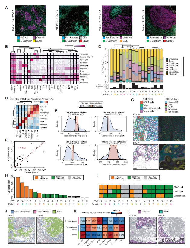 利用多重離子束成像(MIBI)技術(shù),在單細(xì)胞分辨率下解析TME的空間組織。我們對(duì)6例患者的腫瘤前緣進(jìn)行了18個(gè)視野的MIBI掃描,對(duì)38個(gè)腫瘤和基質(zhì)/免疫蛋白標(biāo)志物圖像進(jìn)行分段,確定了55832個(gè)細(xì)胞(圖5A),并且聚類(lèi)分析的主要細(xì)胞類(lèi)型與scRNA-seq細(xì)胞類(lèi)型相似(圖5B)。間質(zhì)和免疫組分在腫瘤內(nèi)和腫瘤間是可變的,12/17的腫瘤患者圖像聚類(lèi)不一致(圖5C)。腫瘤內(nèi)外的CD8 T細(xì)胞、Tregs、巨噬細(xì)胞和CD4 T細(xì)胞存在高度相關(guān)性,尤其前兩者更甚(圖5D)。5/12視野具備足夠的細(xì)胞進(jìn)行系統(tǒng)分析CD8 T細(xì)胞和Tregs距離(圖5F-H),我們發(fā)現(xiàn)了兩者的共定位,并且CD8 T細(xì)胞的比例也與共定位呈正相關(guān),表明Tregs受到TME的共招募和CD8 T細(xì)胞的共定位共同調(diào)節(jié),另外CD4 T細(xì)胞和巨噬細(xì)胞與Tregs共定位(圖5I)。成纖維細(xì)胞、巨噬細(xì)胞和Tregs在腫瘤-間質(zhì)邊緣最豐富,而CD8 T細(xì)胞和中性粒細(xì)胞被大量排除在腫瘤之外,表明 Treg 定位可能阻止效應(yīng)淋巴細(xì)胞進(jìn)入腫瘤(圖5J&K)。已經(jīng)被發(fā)現(xiàn)可以介導(dǎo)免疫抑制或抗腫瘤活性B細(xì)胞是唯一表現(xiàn)出優(yōu)先浸潤(rùn)的細(xì)胞類(lèi)型。