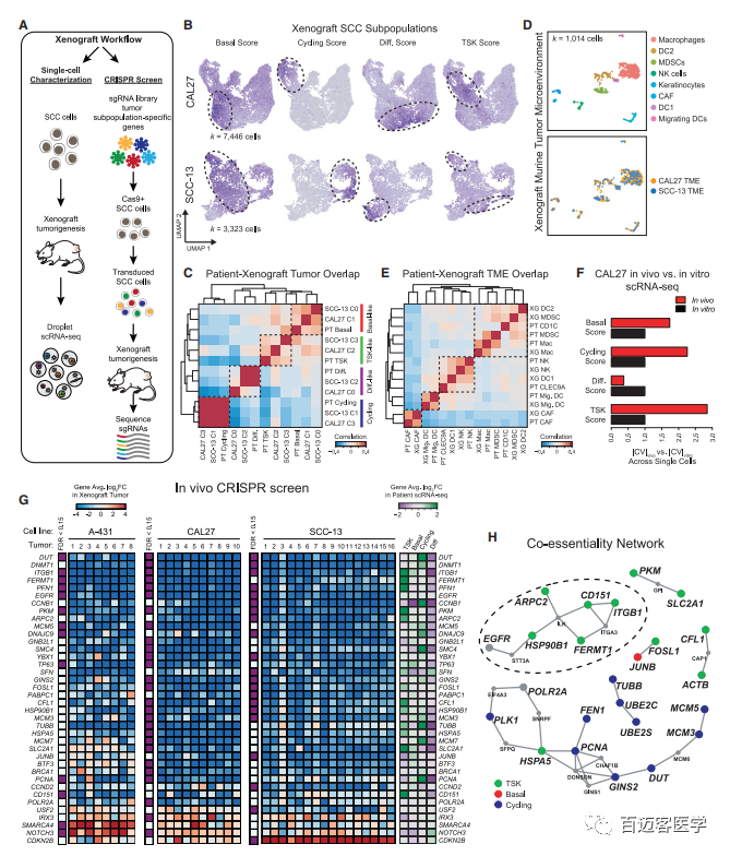 接下來(lái),使用CRISPR/Cas9技術(shù)對(duì)3個(gè)鱗狀細(xì)胞癌移植瘤株進(jìn)行篩選(4個(gè)亞群,334個(gè)富集基因),評(píng)估腫瘤KC亞群的功能作用(圖7A)。通過(guò)STARS算法,獲得38個(gè)命中點(diǎn),其中18個(gè)至少被兩種細(xì)胞系共享(圖7F)。特別的,對(duì)腫瘤生長(zhǎng)重要的基因偏向于在TSK、基底和循環(huán)細(xì)胞中表達(dá)。腫瘤循環(huán)KCs特有的參與細(xì)胞循環(huán)的基因形成了以PCNA和GINS2為中心的最大網(wǎng)絡(luò)。最大的TSK特異性網(wǎng)絡(luò)包括ITGB1、FERMT1、CD151、ARPC2、HSP90B1。ITGB1、CD151和 FERMT1的蛋白產(chǎn)物在細(xì)胞表面相互作用,介導(dǎo)整合素信號(hào)。通過(guò)體外實(shí)驗(yàn)驗(yàn)證ITGB1、FERMT1和CD151對(duì)腫瘤生長(zhǎng)的重要性低于體內(nèi),證實(shí)了如果整合素信號(hào)介導(dǎo)與TME的通訊,相關(guān)基因在體內(nèi)腫瘤發(fā)生中應(yīng)該比在體外有更大的依賴(lài)性的推斷。綜上,體內(nèi)異種移植篩查結(jié)合TCGA分析突出了可能控制亞群特異性致瘤功能的關(guān)鍵基因。