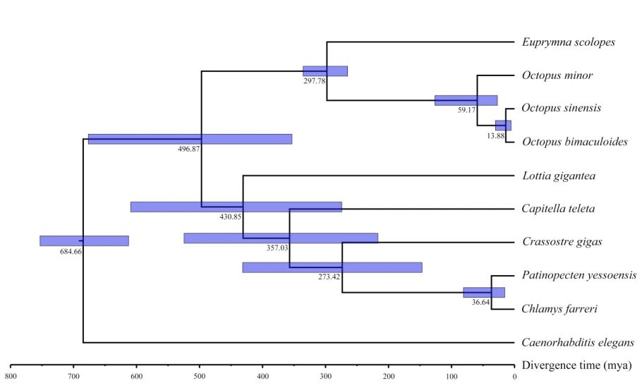 比較基因組學(xué)分析發(fā)現(xiàn)預(yù)測到的31676個基因中有24698個基因可被聚類到17020個基因家族。其中有741個基因家族為10個物種共有,包含有10653個同源基因。利用10個物種的238個單拷貝同源基因構(gòu)建進化樹,結(jié)果表明長蛸的分化時間早于中國真蛸和加州雙斑蛸,而中國真蛸與加州雙斑蛸關(guān)系更近,其分化時間約為13.88 Mya(圖3)。