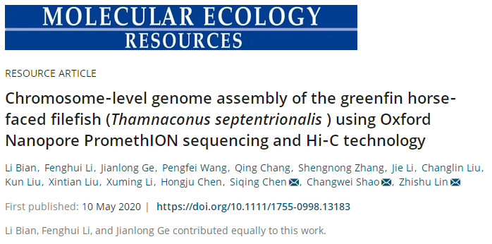 2020年5月,中國水產(chǎn)科學(xué)研究院黃海水產(chǎn)研究所陳四清研究員團隊與北京百邁客生物科技有限公司合作完成了超高質(zhì)量的綠鰭馬面鲀基因組,相關(guān)研究成果發(fā)表在知名期刊Molecular Ecology Resources上。本次研究基于納米孔測序技術(shù)(Nanopore)和染色體構(gòu)象捕獲技術(shù)(Hi-C)完成的基因組僅包含242個Contigs,Contig N50高達22.46 Mb,并將99.44%序列掛載到20條染色體上,實現(xiàn)了海洋魚類基因組組裝質(zhì)量質(zhì)的飛躍。