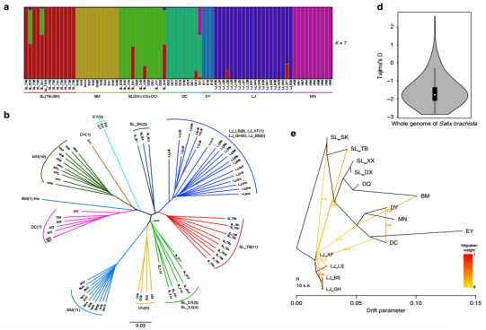 群體進(jìn)化研究:群體材料選擇(重測(cè)序,~22.1x),77個(gè)小墊柳(14個(gè)主要棲息地);