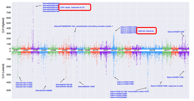 研究結(jié)果2:自然選擇在小墊柳高、低海拔群體中的作用區(qū)域和強(qiáng)度都具有顯著的差異,說明分布于橫斷山區(qū)海拔高差大、生境多樣而異質(zhì)的物種可能在自然選擇的作用下發(fā)生種下的種群分化(Sabra3G0034400DNA修復(fù),Sabra12G0047600細(xì)菌防御應(yīng)答,Sabra16G0101100細(xì)胞對(duì)DNA損傷刺激的應(yīng)答和對(duì)寒冷的應(yīng)答)。