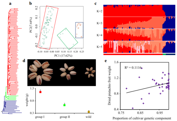 研究結(jié)果1:揭示了開心果的兩步馴化過程(栽培種質(zhì)分為兩個(gè)群。栽培種Group I的LD值最高,栽培種Group II和野生開心果的LD衰減值相近。Group II包括 Qazvini,Italiaei和Badami Zarand在內(nèi)的5種類型的個(gè)體,且這些種質(zhì)被記錄為古代具有種子的材料);