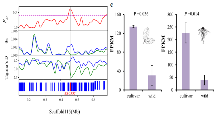 研究結(jié)果2:在開心果中,基因組上約有 9.2 Mb 的區(qū)域被鑒定為具有高水平的群體分化,包含665個(gè)基因,其中開心果株型可能與 SAUR55 基因的選擇相關(guān),同時(shí)該基因 表現(xiàn)出了顯著增加的表達(dá)水平;果實(shí)重量的變化發(fā)生在馴化與人工選擇期間(CYCD7-1基因)。